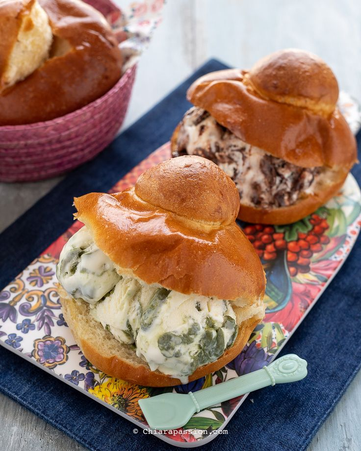 Jeśli jesteś na Sycylii, koniecznie spróbuj brioche col tuppo – to miękka, maślana bułeczka z charakterystycznym „kokiem” na górze (tzw. tuppo). Jest puchata, delikatna i świetnie smakuje z lodami lub granitą. To klasyka sycylijskiego śniadania – lodowy rogalik na dobry dzień! 😋
