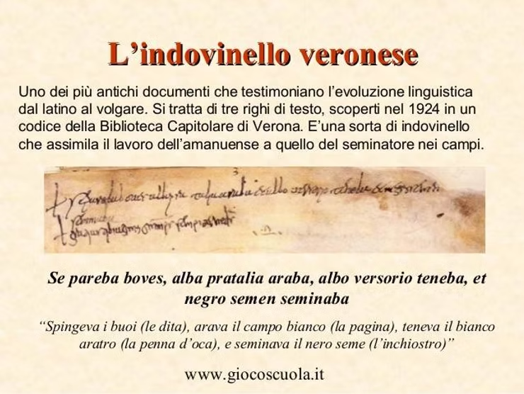 Pierwsze przekazy, z których dowiadujemy się o językach volgari, nie mają charakteru literackiego. Zazwyczaj są to wzmianki na ich temat przy innej okazji. Pierwszym dokumentem w języku ludowym była „zagadka werońska” (indovinello veronese), zagadka zapisana na marginesie pergaminowego rękopisu przez werońskiego kopistę. Odkryta została w 1924 roku i przez długi okres czasu uważana była za pierwszy tekst w języku włoskim.